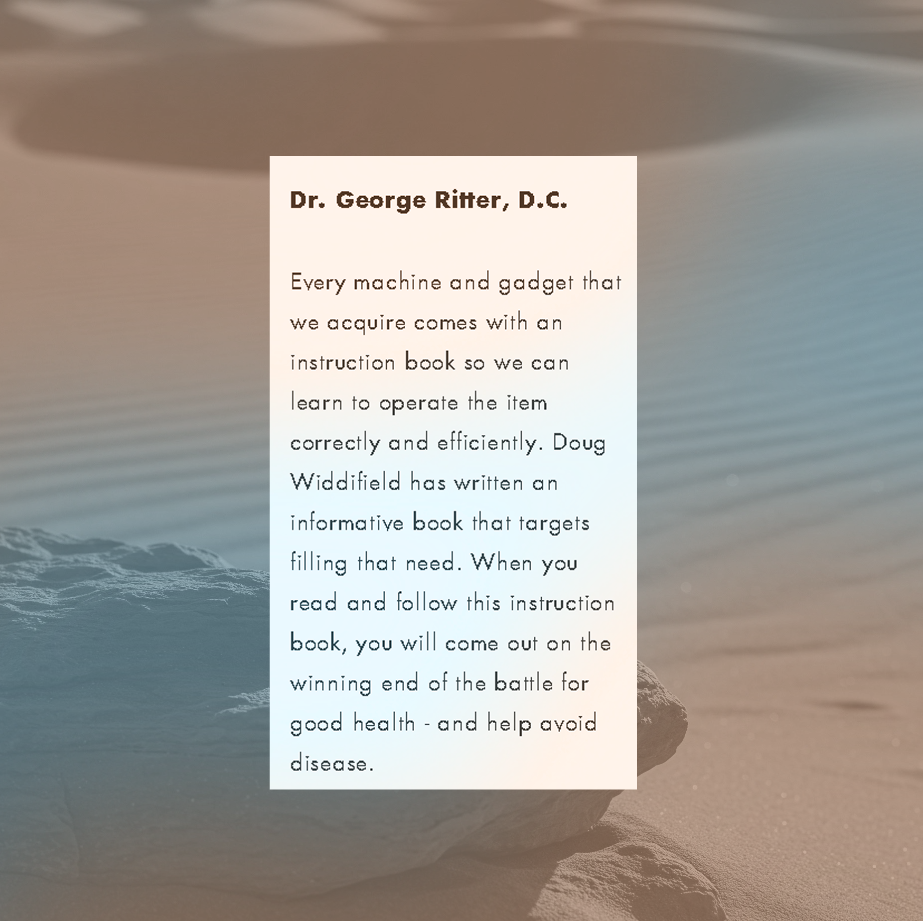 Every machine and gadget that we acquire comes with an instruction book so we can learn to operate the item correctly and efficiently. Doug Widdifield has written an informative book that targets filling that need. When you read and follow this instruction book, you will come out on the winning end of the battle for good health - and help avoid disease.